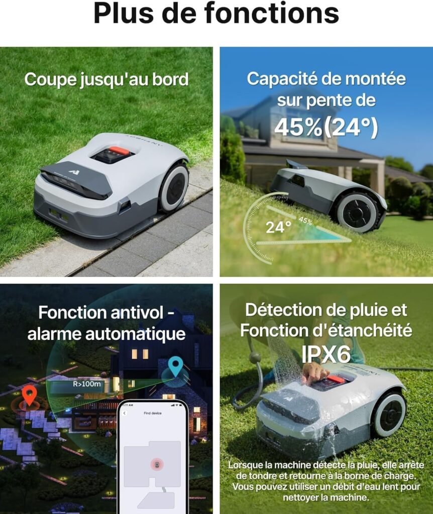 - La capacité de travail : Idéal pour les grands jardins qui demandaient auparavant des robots professionnels très coûteux.