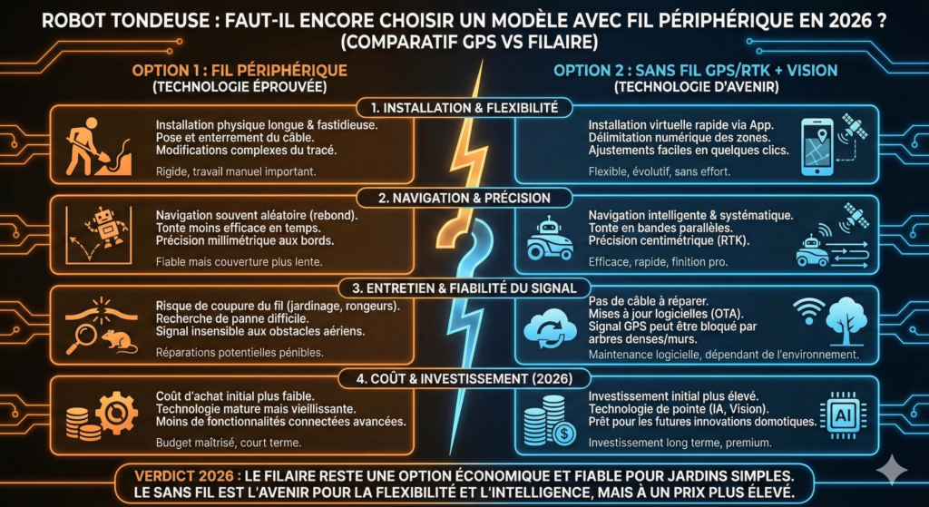 Robot Tondeuse : Faut-il encore choisir un modèle avec Fil Périphérique en 2026 ? (Comparatif GPS vs Filaire)